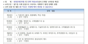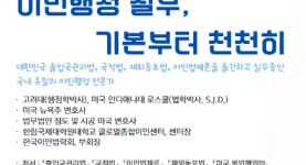 [특강 안내] o 주 제: 이민행정 및 국적 실무 특강 o 일 정 : 1.24.~3.21.간 총8회 (2.21제외)(매주 토) 오후2시~5시(3시간) o 방 법 : 현장강의(20명) 및 LIVE 화상교육실시 (1개월 녹화영상 제공)* 현장 강의 위치: https://koivaoffice.co.kr/service o 교육수준 …